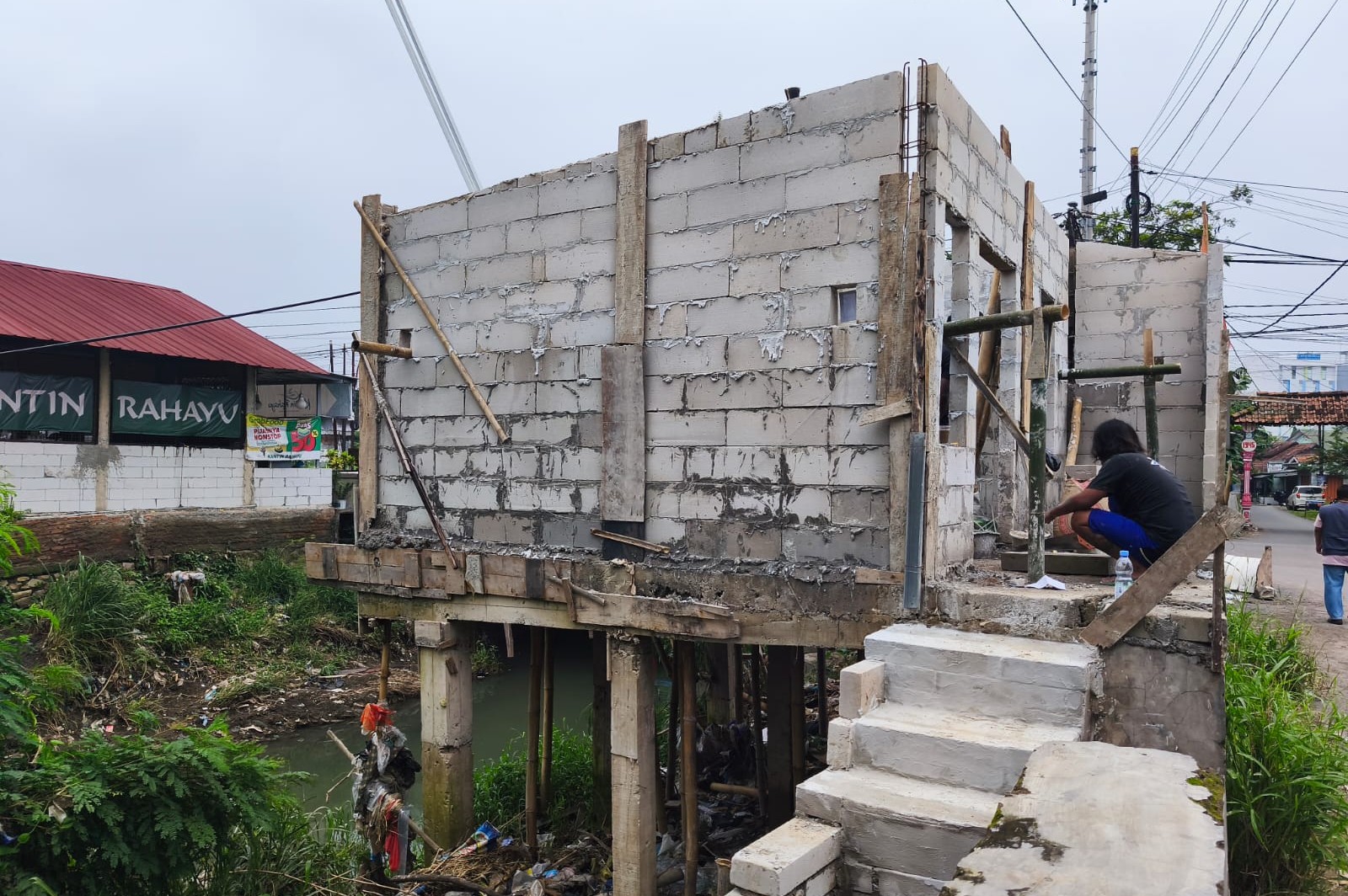 Tampak sejumlah tukang bangunan tengah mengerjakan pembangunan bangli dengan penyangga beberapa tiang. Terlihat jelas tiang penyangga bangunan berbentuk cor berada di badan sungai.
